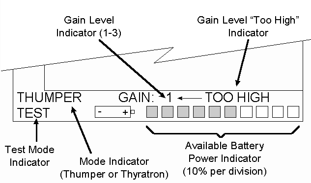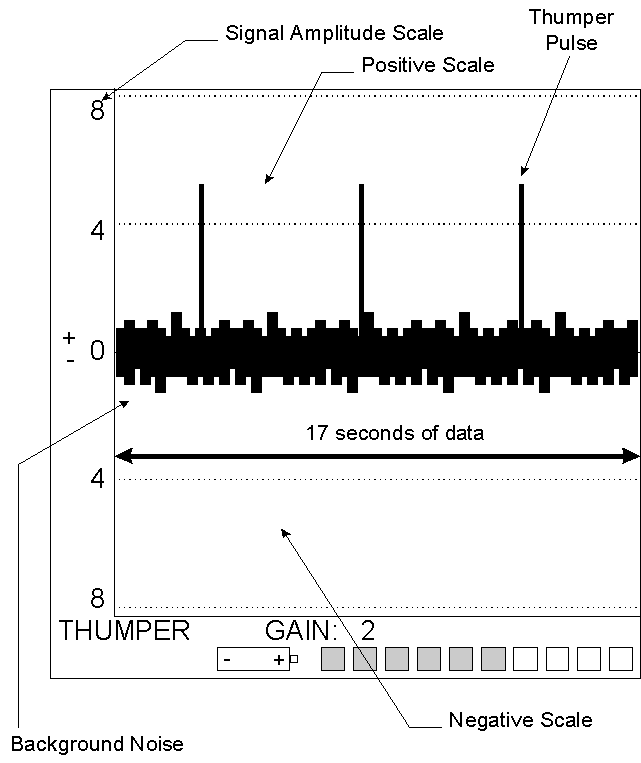 The display plots a trace of the processed Test Set signal. The Test Set signal also includes a band of background noise from other sources in the environment. The X35 greatly suppresses this background noise with internal processing. The vertical axis is the signal level axis, and the horizontal axis the time axis. The horizontal axis represents about 17 seconds of time allowing the display of 2 to 3 Thumper pulse simultaneously. The time axis will be continuously updated with the latest Test Set signal information while removing the oldest information. When the signal trace reaches the right-hand edge of the display, it restarts again at the left edge, erasing the old trace as it sweeps across the display. The new signal trace is separated from the old trace by about a one-second gap at its moving edge. At any time, the operator may "freeze" the display by pressing the HOLD button to study the readings. Pressing HOLD again restores operation.