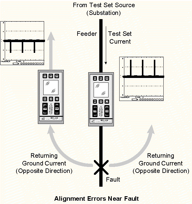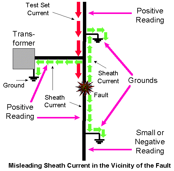 A. This situation can occur when the measurement is being made too close to the fault. The signal displayed is not the Test Set current on the main conductors, but rather the returning sheath or earth current that is returning from the fault breakdown along neighboring grounds, cables, or pipes.