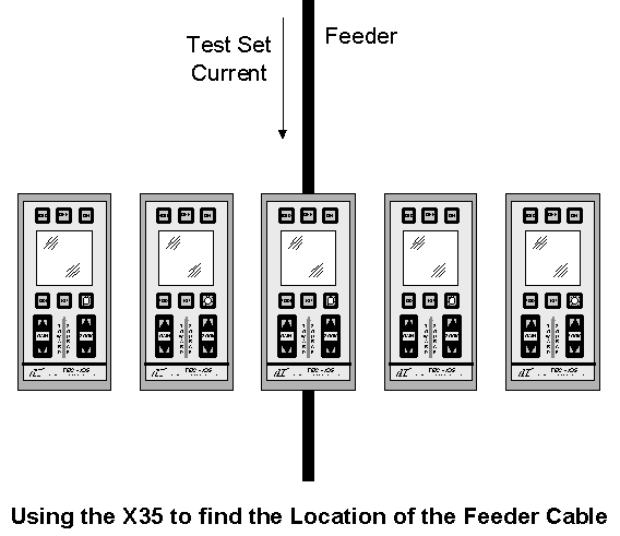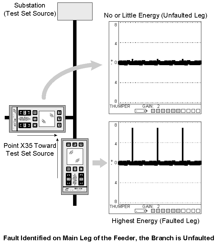 The X35 is used to take a series of readings of Thumper or Thyratron Test Set signals above the faulted feeder, beginning near the Test Set location and working out along the feeder toward the fault. Where a feeder branches, the faulted branch generally has the largest reading. This tracing procedure continues until the reading drops off significantly indicating that the fault has been passed.