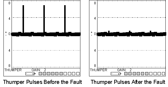 Typical Thumper pulses (below) appear in the display as regularly spaced narrow peaks separated by 6-7 seconds (depending on the adjustment of the Test Set).