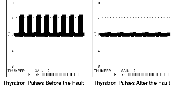 Prior to the fault, Test Set pulses should be prominent, while after the fault, Thyratron