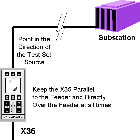 The X35 must always point parallel to the feeder and in the direction of the Test Set source (see figure below).