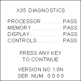 Turn on the X35 unit. After the diagnostics complete, the X35 is in the standby condition waiting for the operator to press a button ("press a key"). Any button, except the power "ON" or "OFF" button, may be pressed. The purpose of this requirement is to enable the X35 to automatically shut off in case the unit is inadvertently turned on. If no key is pressed, the X35 will shut off in 1 minute to conserve battery power.